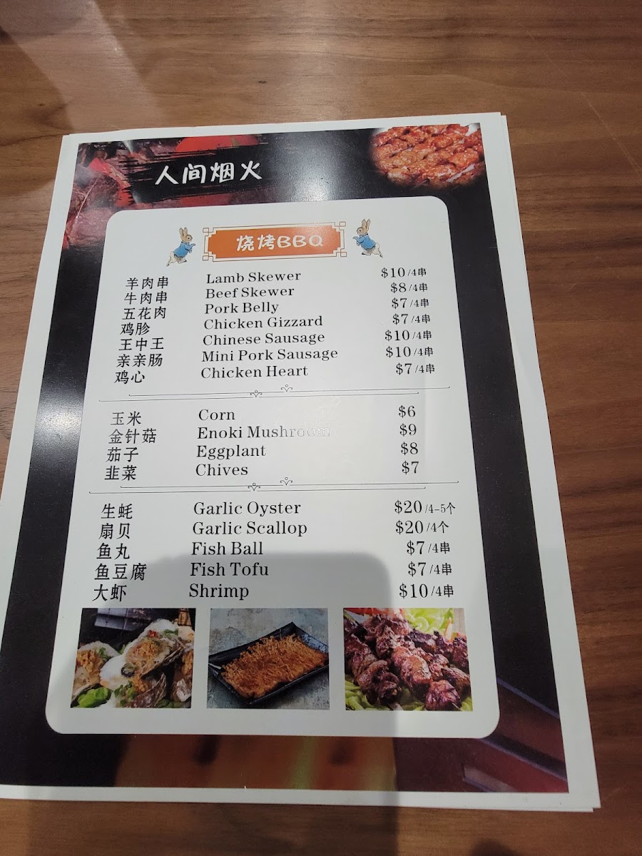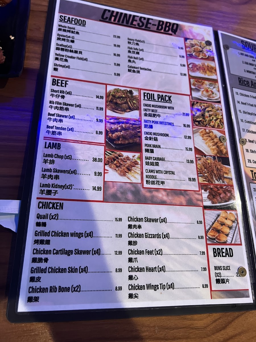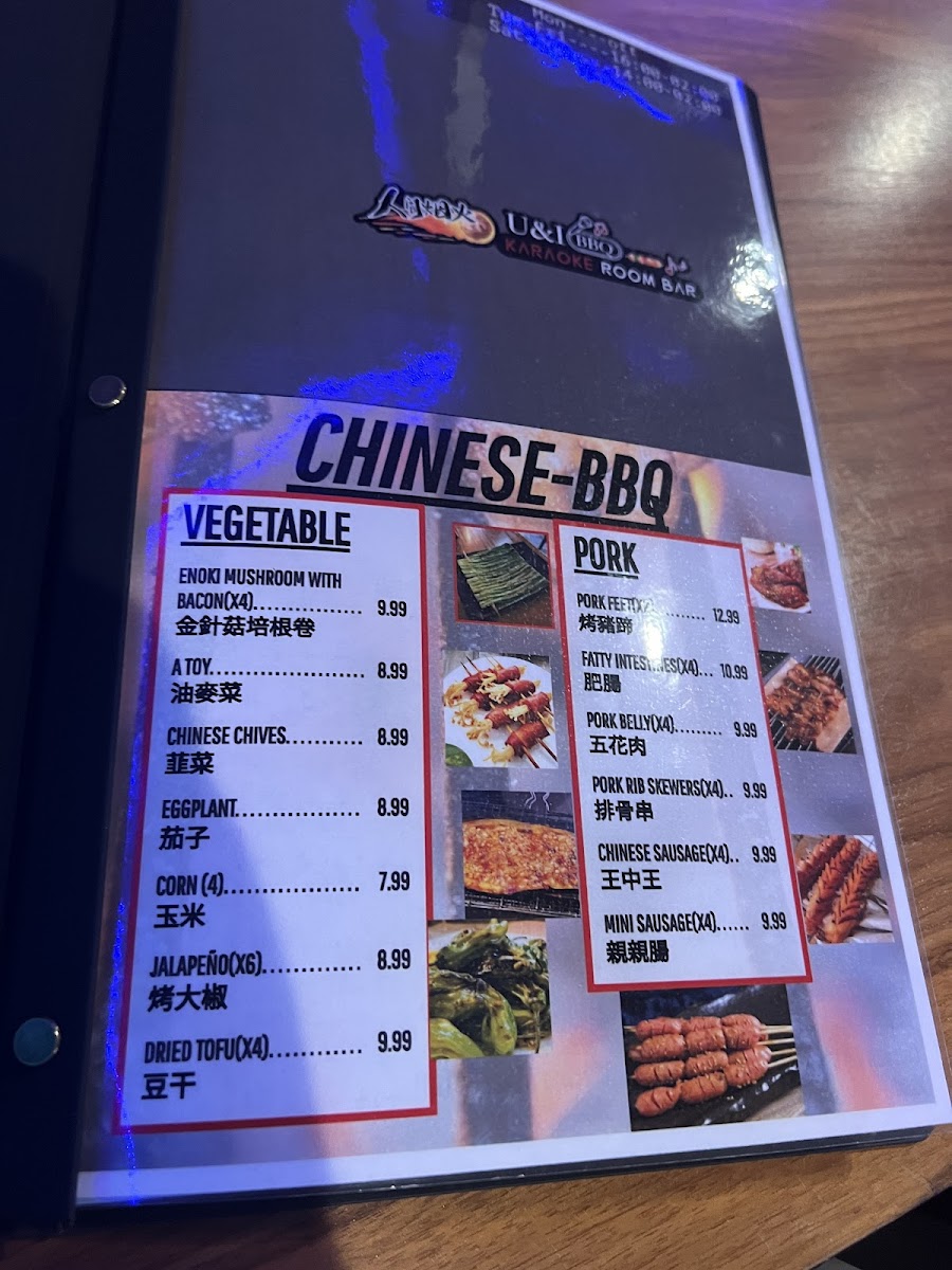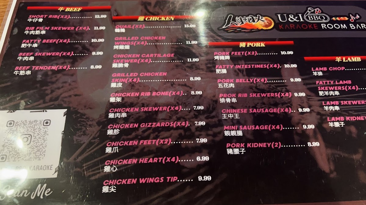The menu at U&i BBQ Karaoke Bar offers a diverse and flavorful selection, blending various meat, seafood, and vegetable dishes with both traditional and unique BBQ options. For pork lovers, choices include Mini Sausage (X4) for $7.99, Chinese Sausage (X4) at $9.99, and Pork Belly (X4) for $10.99, along with delicious Pork Rib Skewers (X4) at $8.99. Lamb enthusiasts can enjoy Lamb Chop (X5) for $13.99 or Lamb Skewers (X4) at $11.99, while chicken options feature Chicken Skewers (X4) for $8.99 and Quail (X2) at $9.99. Beef offerings include Beef Tendon (X4) for $10.99, and Short Rib (X6) at $12.99. If you're in the mood for something unique, the Pork Brain foil pack is available for $9.99, along with other items like Clam With Crystal Noodle and Enoki Mushroom with Fatty Beef. The menu also includes savory Shrimp Fried Rice, Combination Lo Mein, and hearty Fried Dumplings (8) for $7.99. For appetizers, customers can enjoy Crab Cheese Wontons (6) at $7.99, or Egg Rolls (2) for $5.99. A variety of soups like Wonton Soup and Hot and Sour Soup complement the main dishes. To wash it down, there's a selection of drinks including Red Bull and Ice Red Tea, with prices typically around $2.99 to $4.99. With an assortment of BBQ, stir-fried, and traditional Chinese options, U&i BBQ Karaoke Bar caters to a wide range of tastes, making it a great spot for both casual dining and karaoke fun.